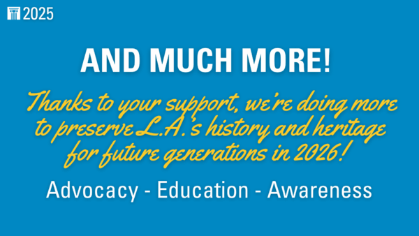 With your support, we raised $124,000 to power our work educating the public and advocating for the preservation of historic places that define Los Angeles County and its heritage. We are grateful to Trina Turk, Wesley Phoa & Margaret Morgan, and Tom Dolby & Spencer Alcorn, who matched every donation up to $50,000!