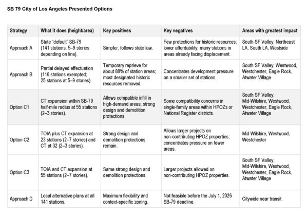 In November 2025, the Planning Land Use and Management (PLUM) Committee deliberated on how the City of Los Angeles should implement Senate Bill 79, the most contentious housing bill of 2025. City Planning presented four “approaches” for implementing SB-79. On February 24th, 2026, City Planning returned to PLUM with additional analysis and three “options” for Approach C that would create new development incentive areas in order to temporarily delay SB-79 citywide.