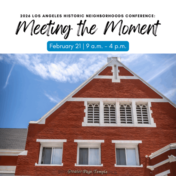 Mark your calendar for the 2026 L.A. Historic Neighborhoods Conference, Meeting the Moment! We’re gathering at Greater Page Temple to explore how creative preservation meets real solutions for policy, community building and resilient neighborhoods. This event is presented by the Los Angeles Conservancy and City of Los Angeles Office of Historic Resources.